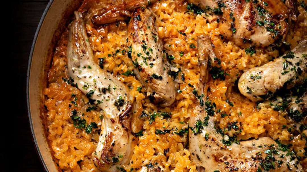 Continúe cocinando a fuego alto hasta que el caldo hierva. Baje el fuego al mínimo y coloque la olla sobre un tostador. Agregue la carne de conejo a la olla y revuelva. Cocine tapado durante 30 minutos o hasta que el arroz esté al dente.