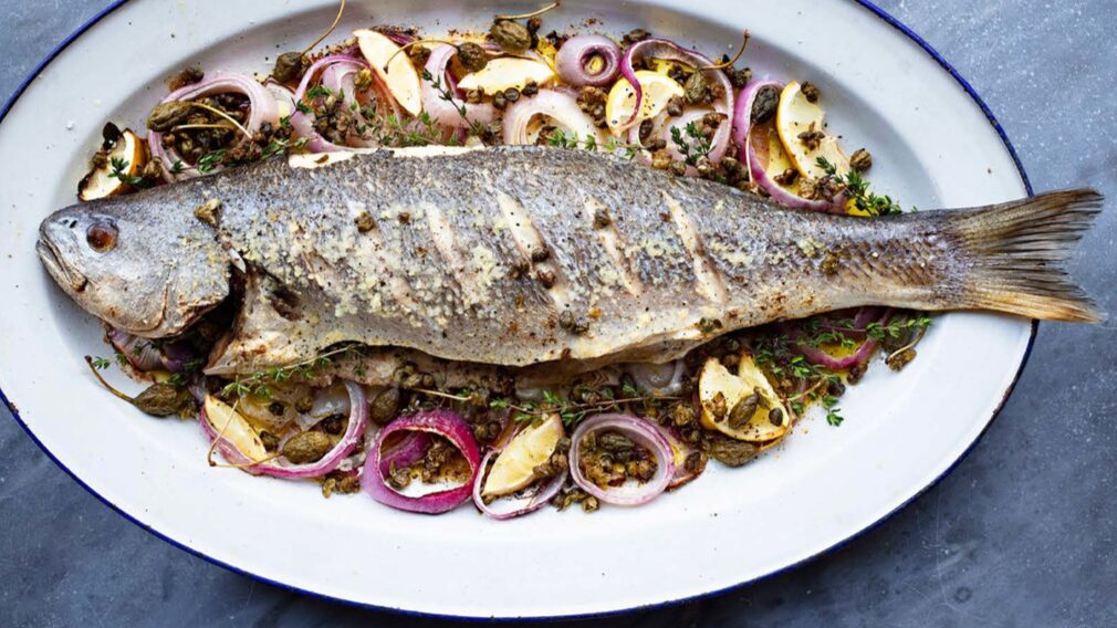 Sobre una bandeja o fuente para horno, ponga los aros de cebolla y las rodajas de limón. Encima, coloque la corvina entera y, con un cuchillo afilado, haga 4-5 cortes diagonales sobre ella.