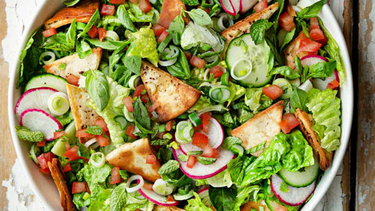 Este plato muy conocido en Medio Oriente es ideal para un almuerzo de verano. Usa varios aliños difíciles de encontrar en el supermercado, pero que se compran fácilmente online. El sumac le da un toque alimonado y la melaza de granada, que es a la vez ácida, picante y también algo dulce, aporta un sabor único.