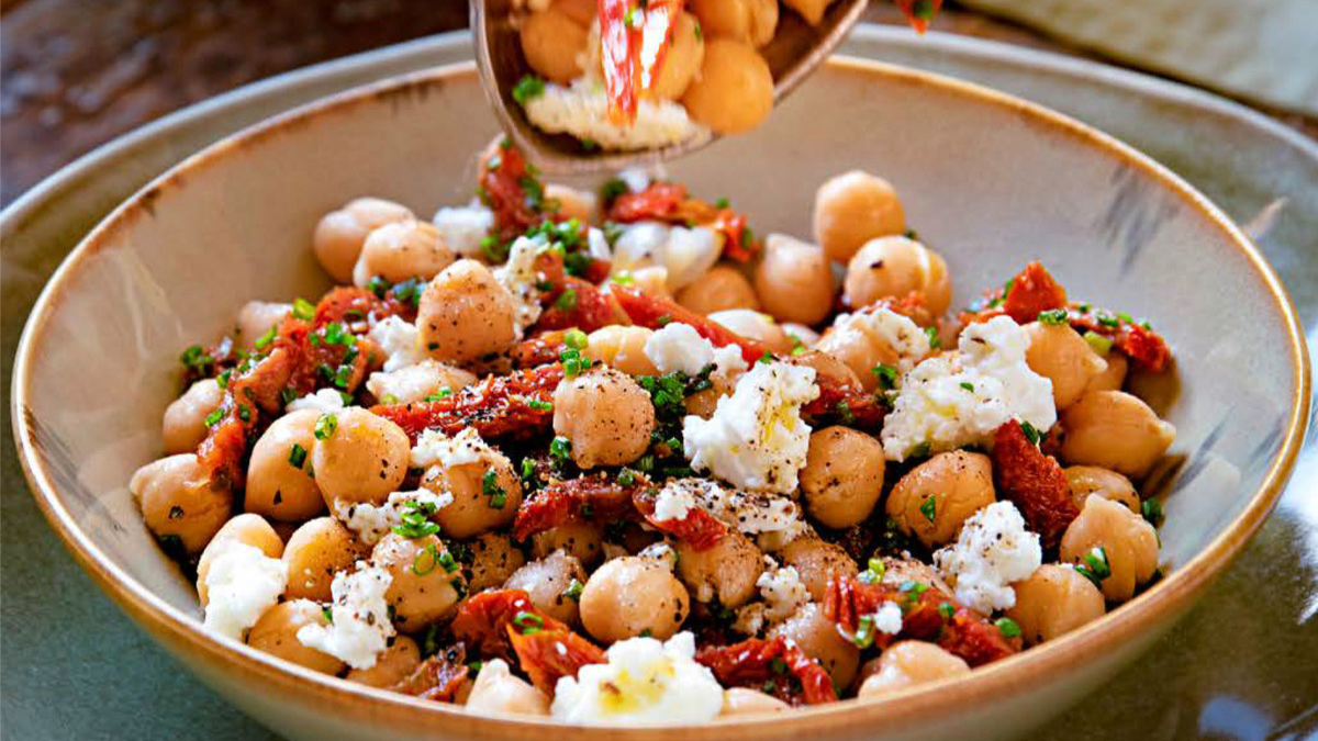 Cuando los garbanzos suelten el primer hervor, cuele y agréguelo al sartén. Incorpore el queso y la ciboulette. Revuelva firme para que el queso se derrita solo un poco.