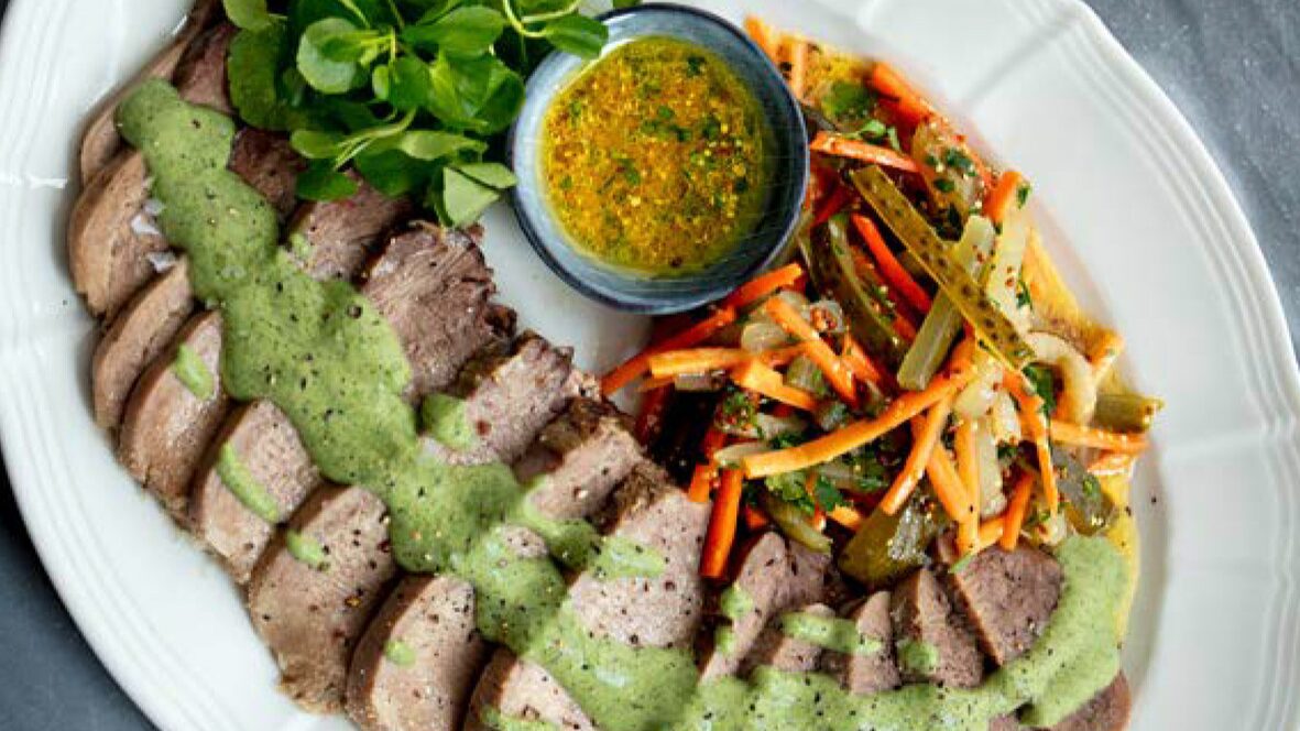 Para servir, corte la lengua transversalmente en rodajas finas y colóquelas en un plato en una sola capa. Rocíe con unas gotas del líquido de la cocción. Ponga la salsa sobre la lengua y agregue las hojas de perejil recién cortadas, acompañado por un generoso chorro de aceite de oliva.