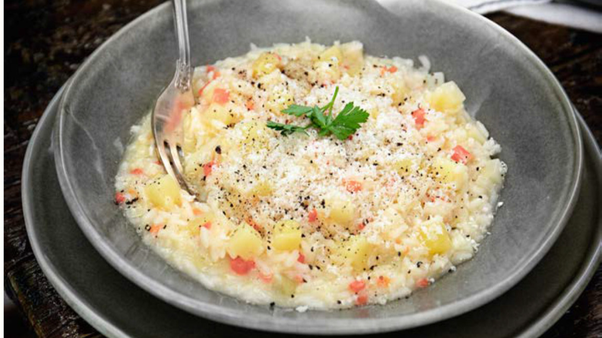 Para que todo alcance su punto al mismo tiempo, se deben sancochar las papas y la zanahoria previamente o cortar todo en trozos más bien pequeños para que se cocinen cuando el arroz esté en su punto.