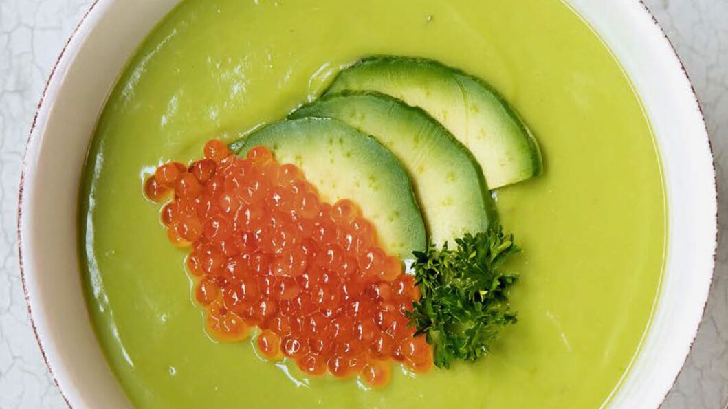 Sirva la sopa fría en los platos, agregue las medias lunas de palta y coloque una cucharadita de huevos de salmón. Finalmente, añada las hojas de perejil, unas gotas de limón y sirva de inmediato.